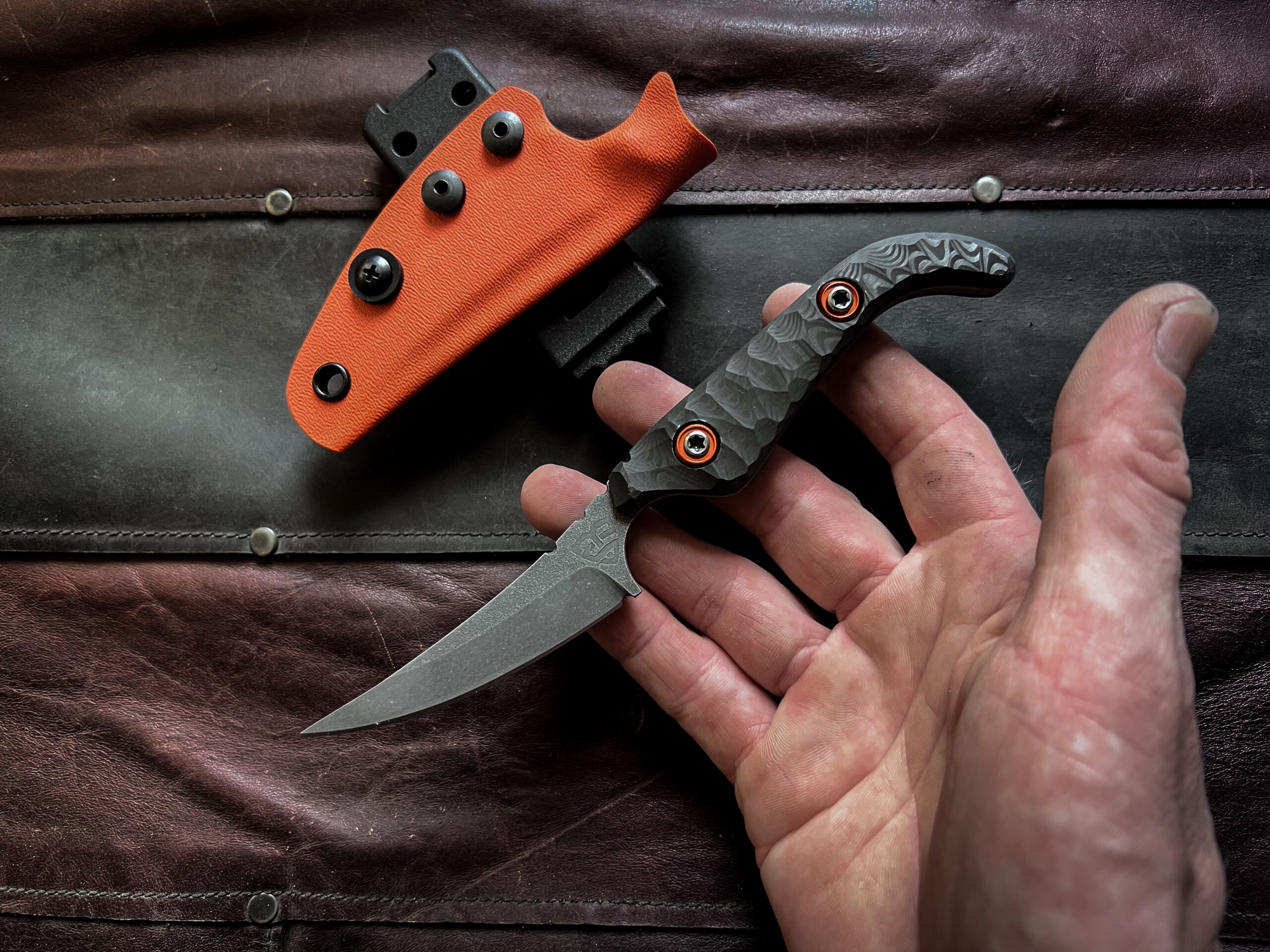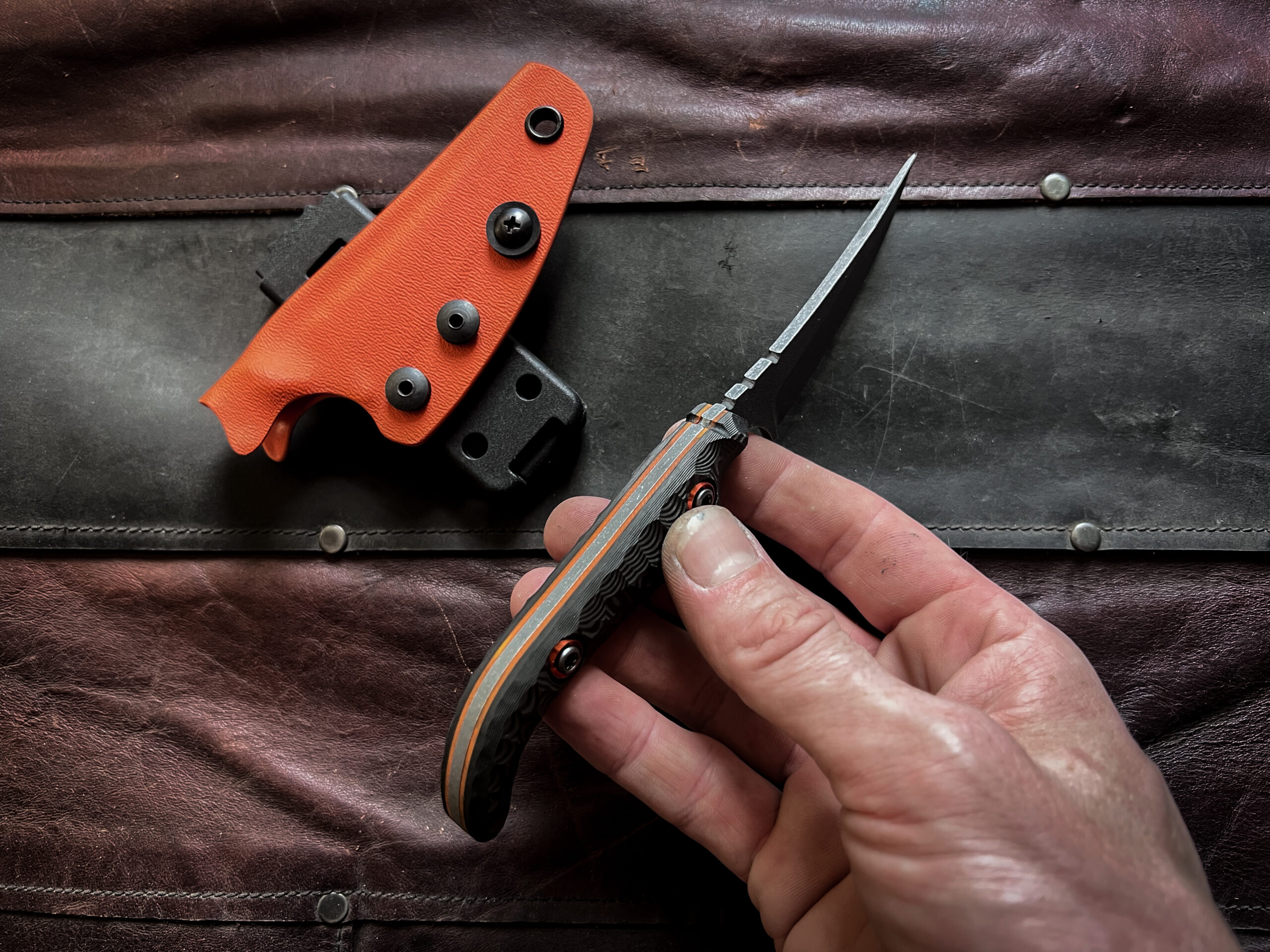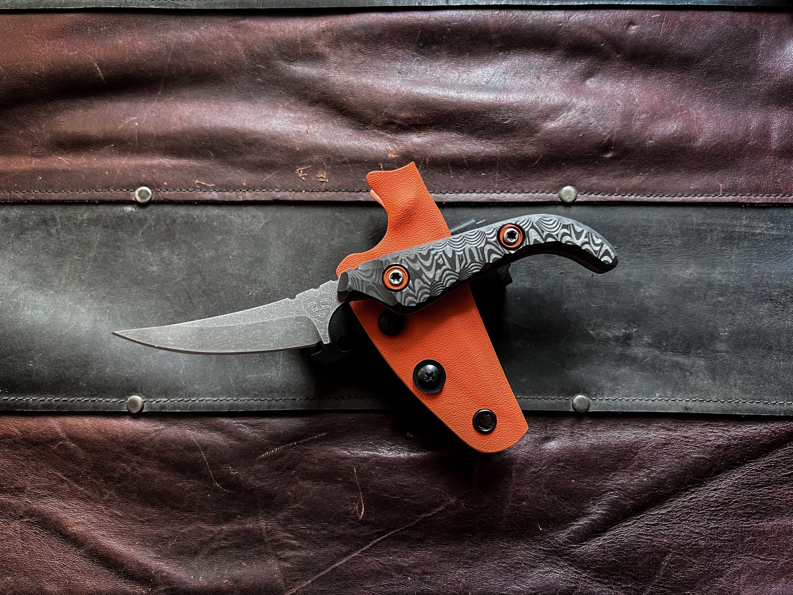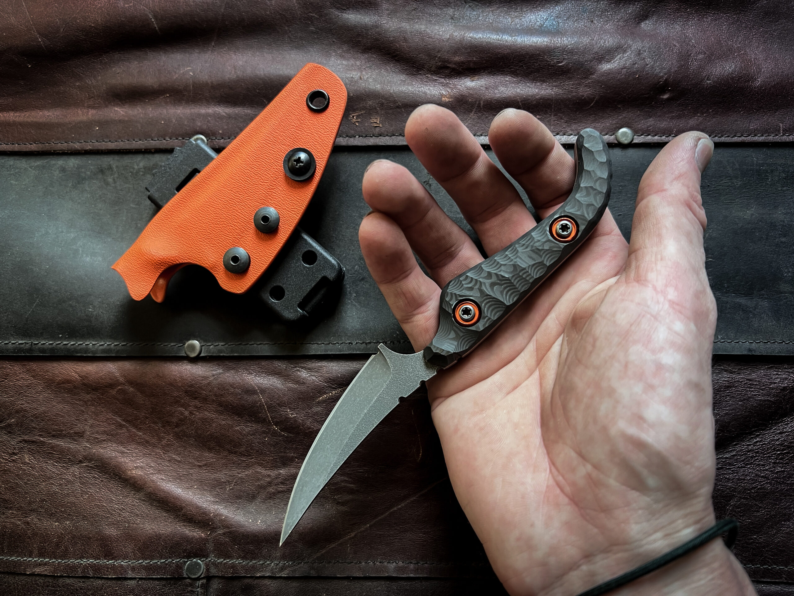 Orange G10 liners, 3K Twill wave Carbon fiber. Stainless steel screws with Orange washers