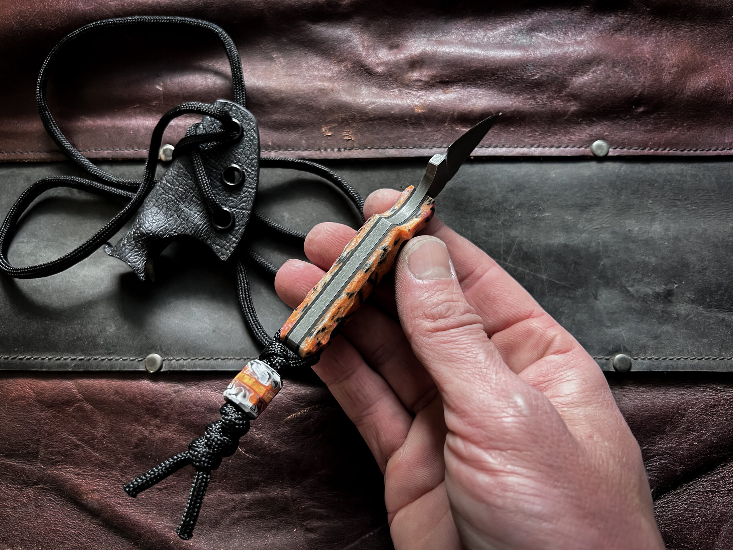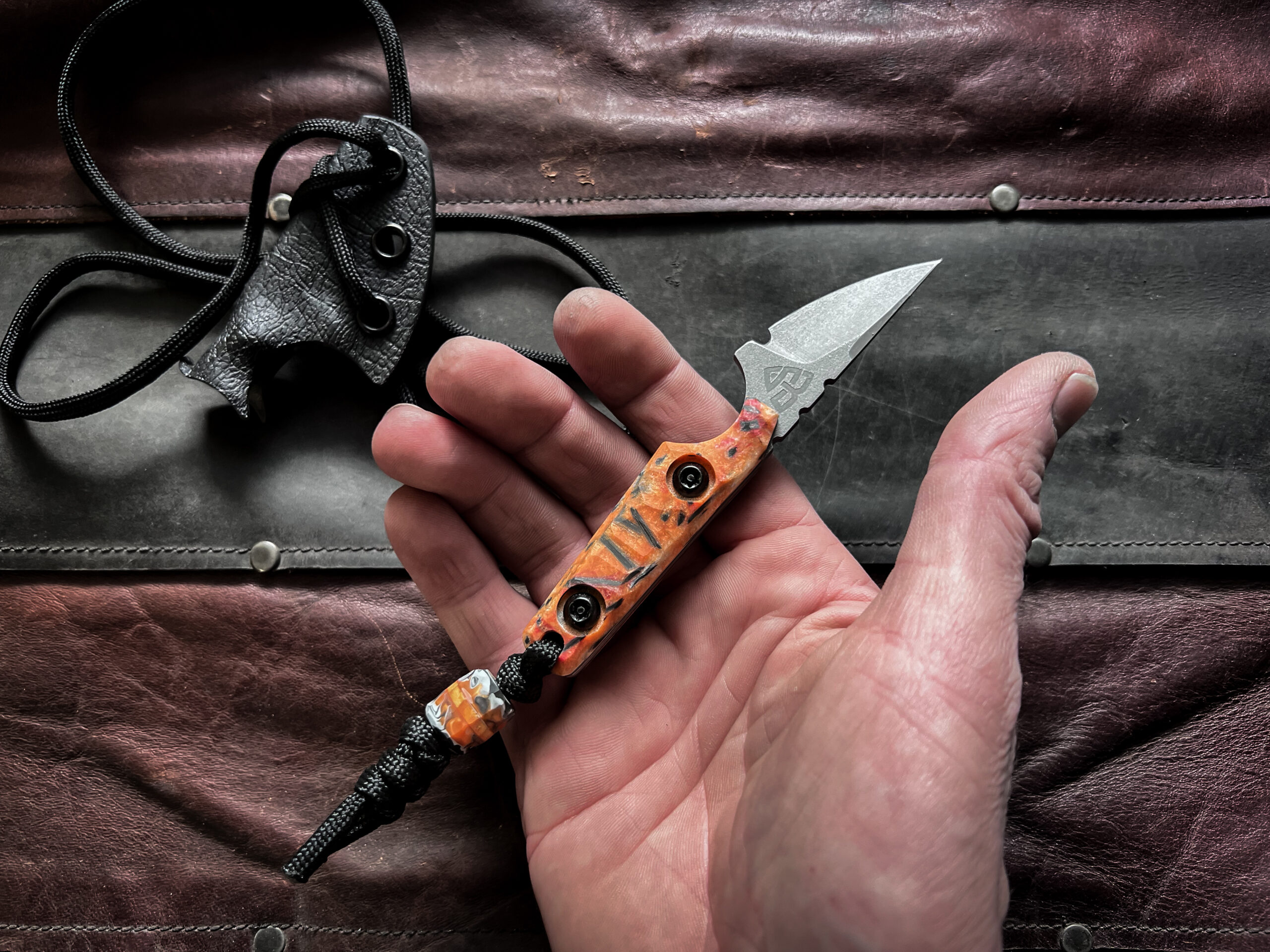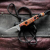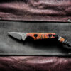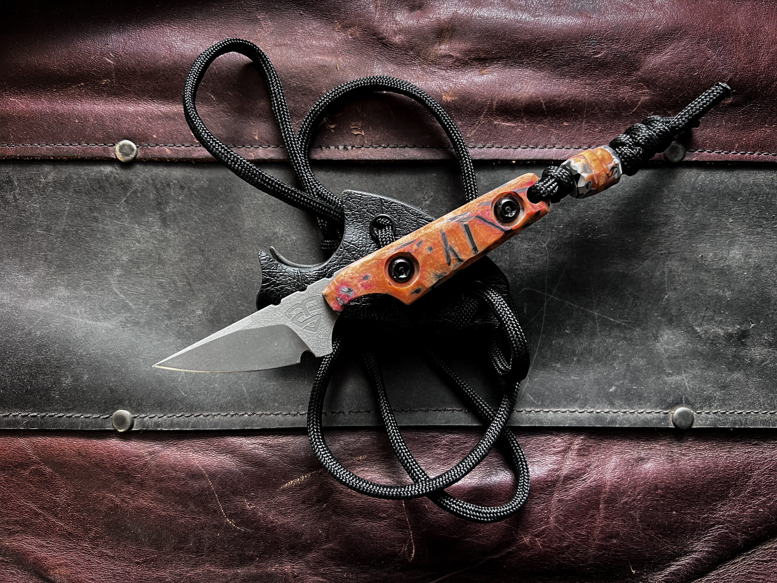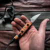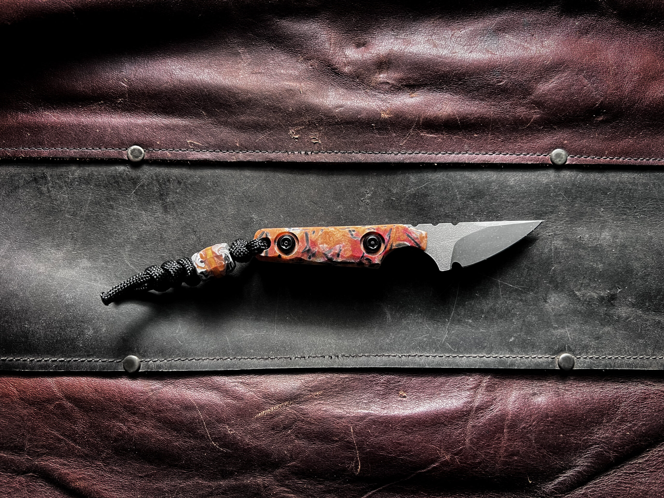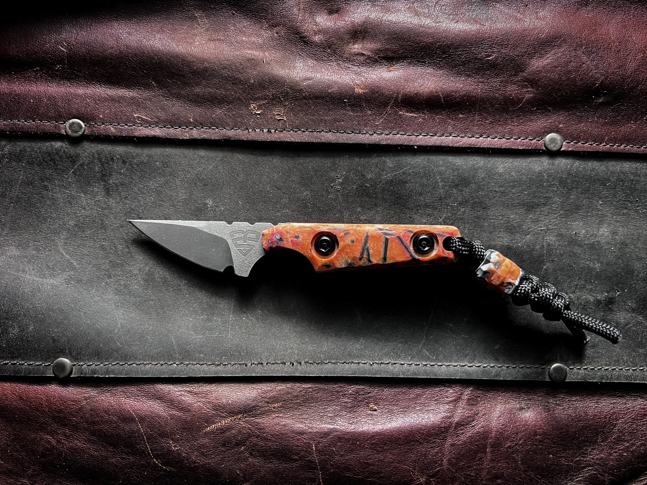 Black G10 liners, Mixed epoxy resin (Orange/White) with shredded carbon. Black stainless steel screws