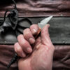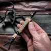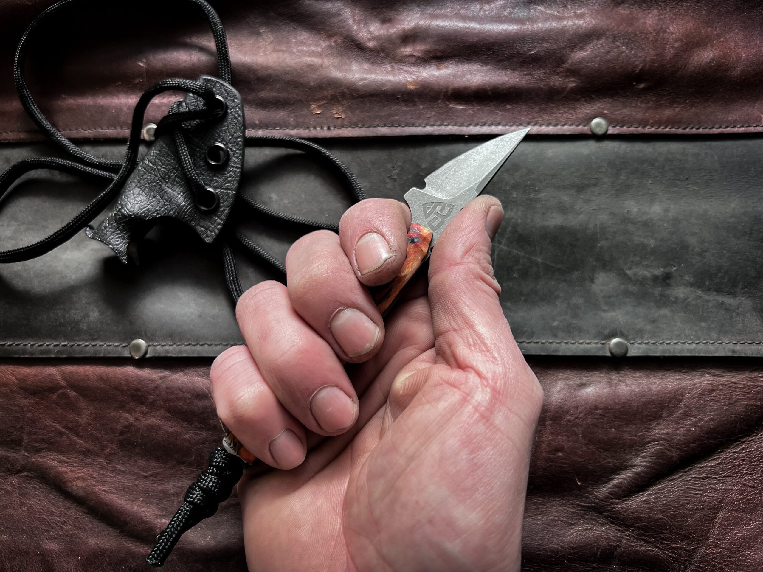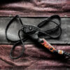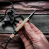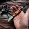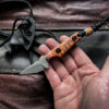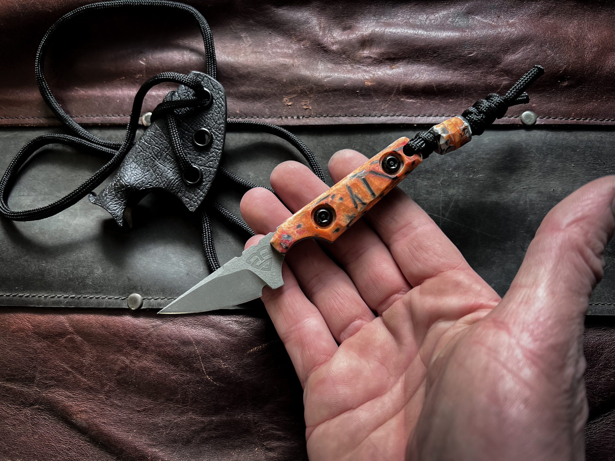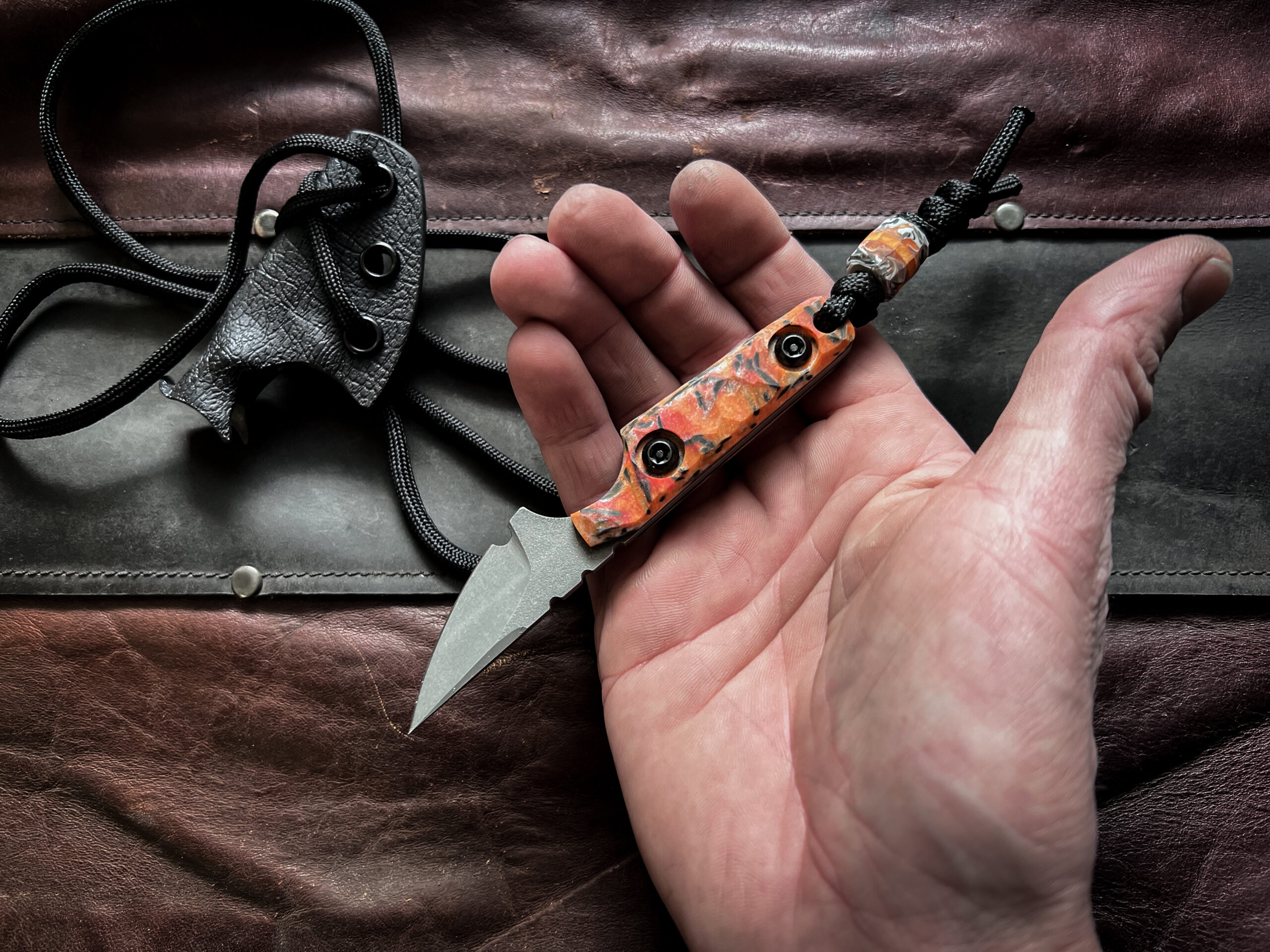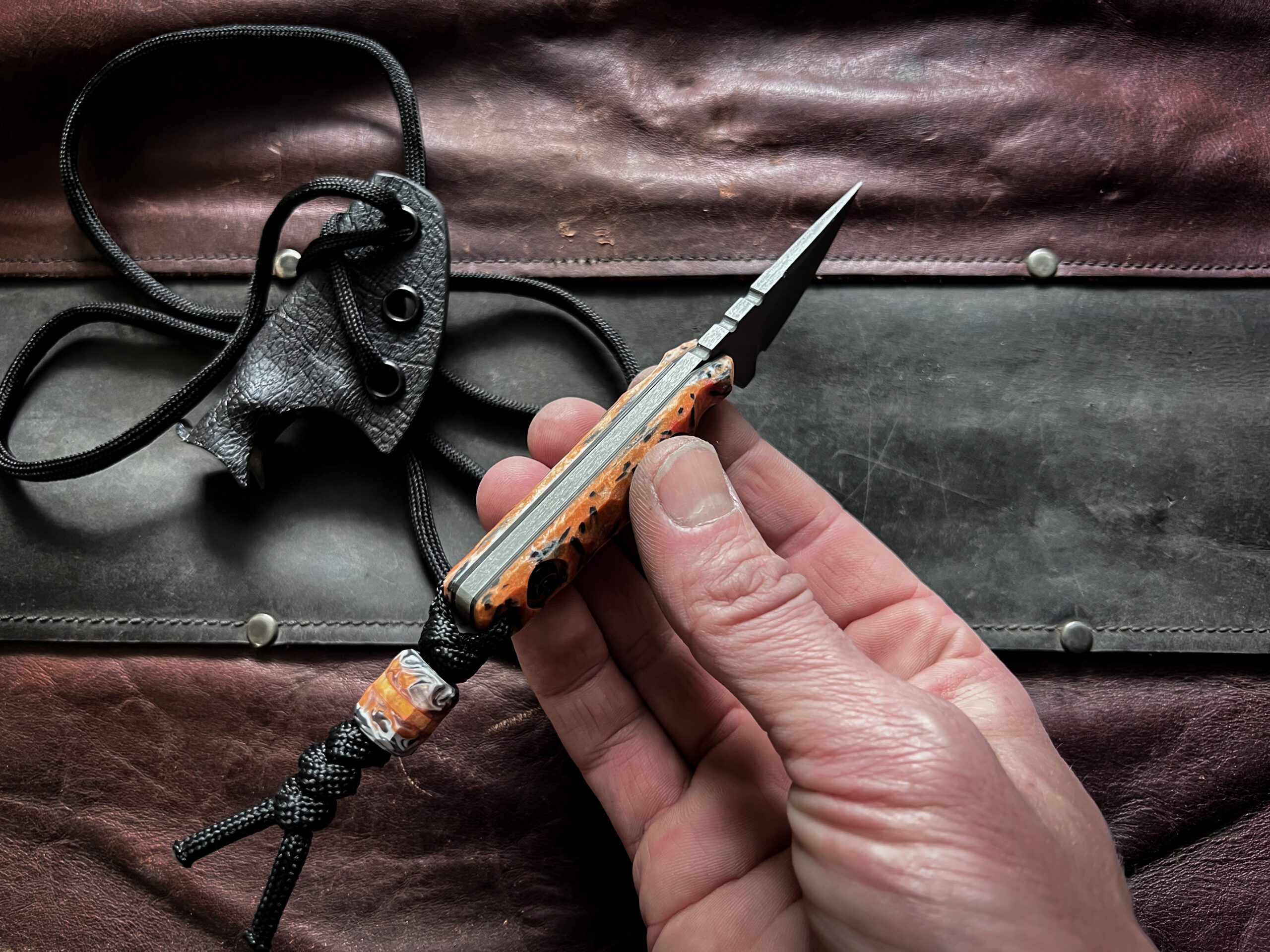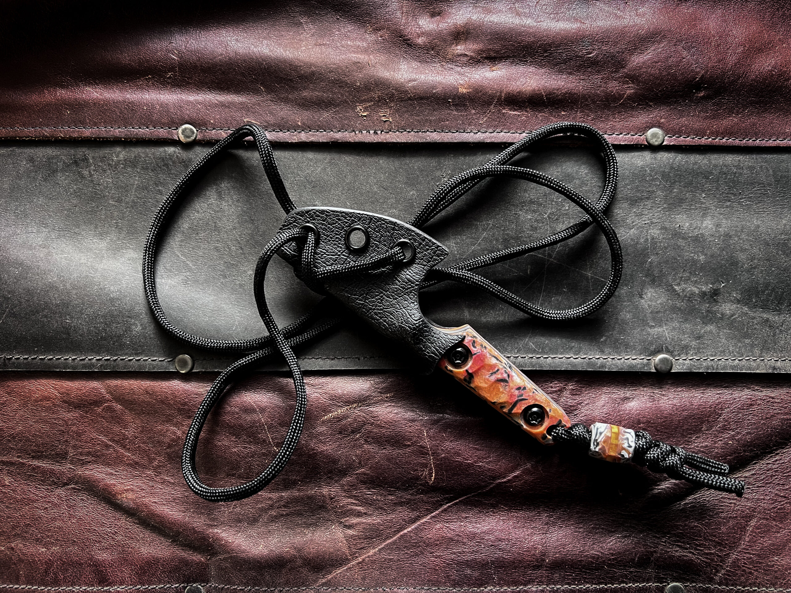 Black G10 liners, Mixed epoxy resin (Orange/White) with shredded carbon. Black stainless steel screws