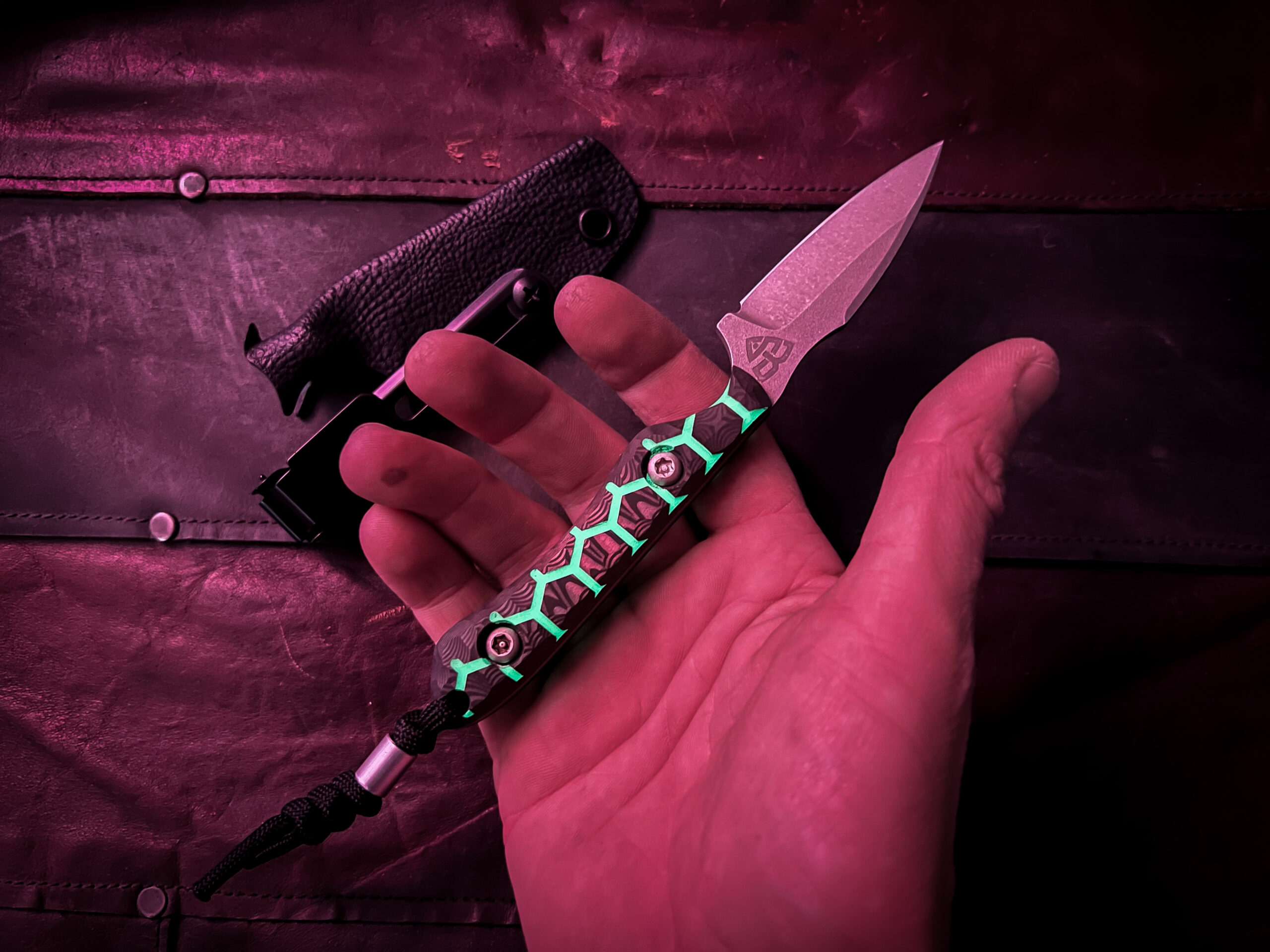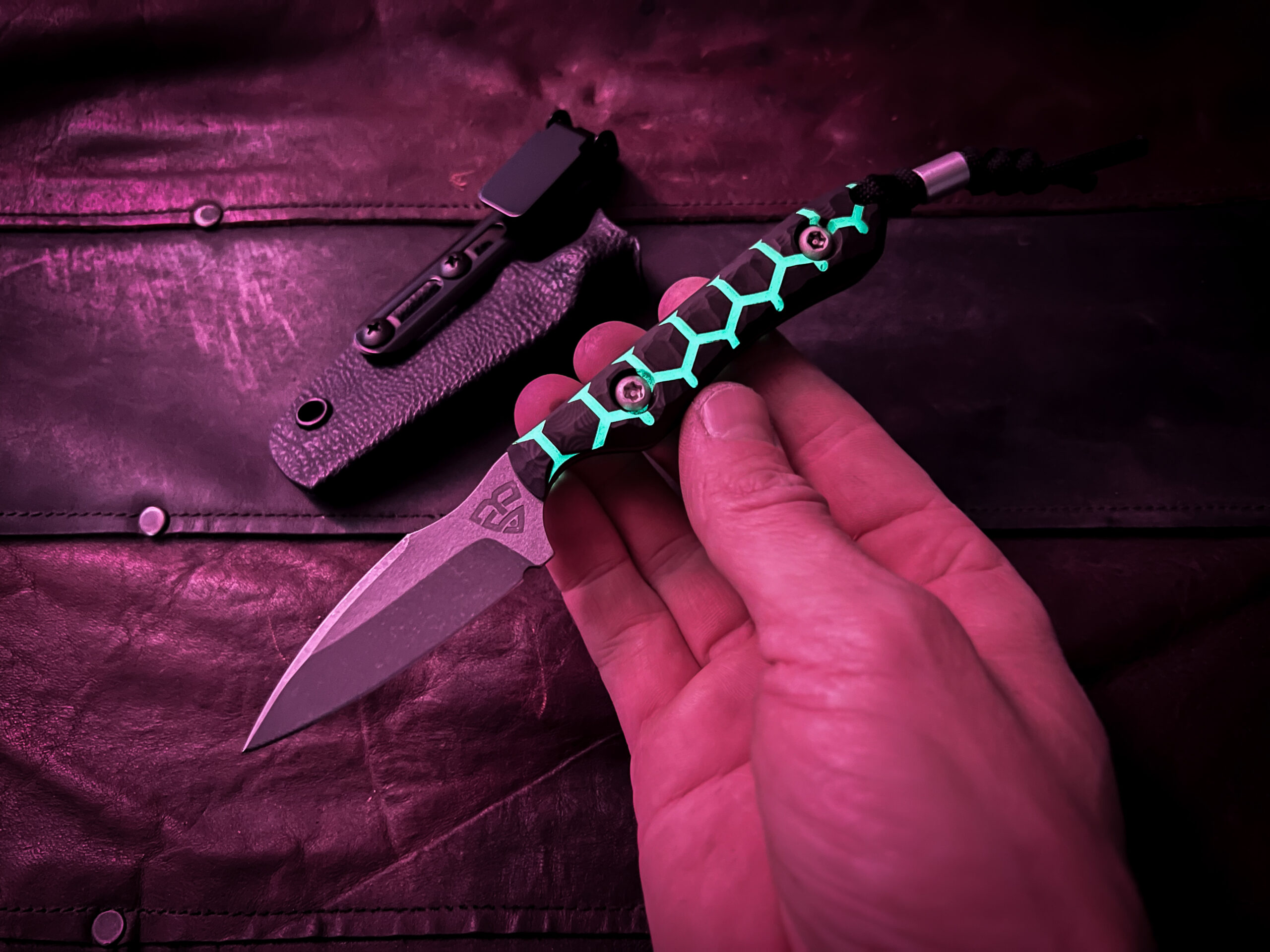 Black G10 liners, Carbon fiber with Glow in dark honeycomb pattern . Stainless steel screws
